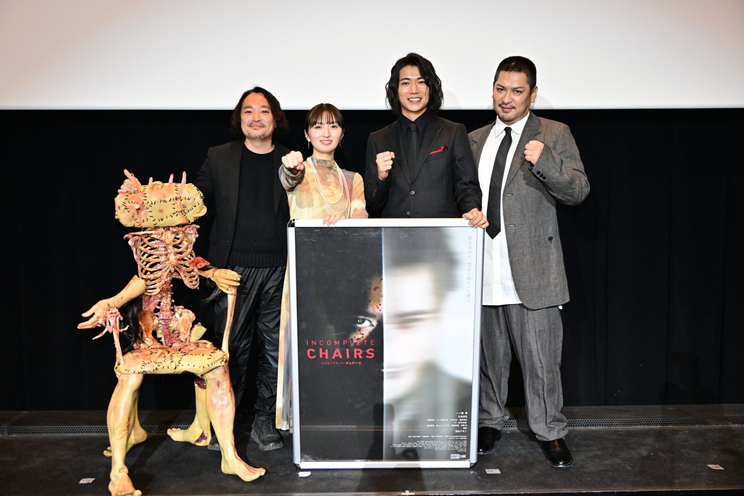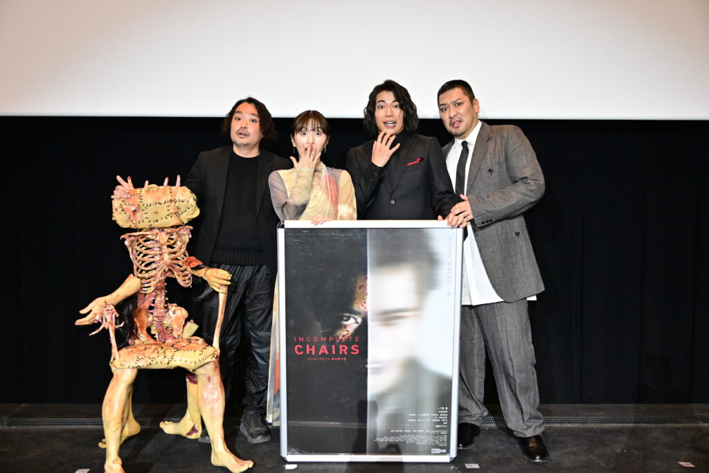 人体を使って“一脚の椅子”を完成させるという衝撃的な発想の、R18指定ハードコア・スラッシャームービー『インコンプリート・チェアーズ』が、ついに全国公開された。公開初日の翌日となる1月24日には、新宿バルト9にて公開記念舞台挨拶が行われ、主演の一ノ瀬竜をはじめ、共演の大島涼花、藤井アキト、そして宇賀那健一監督が登壇した。