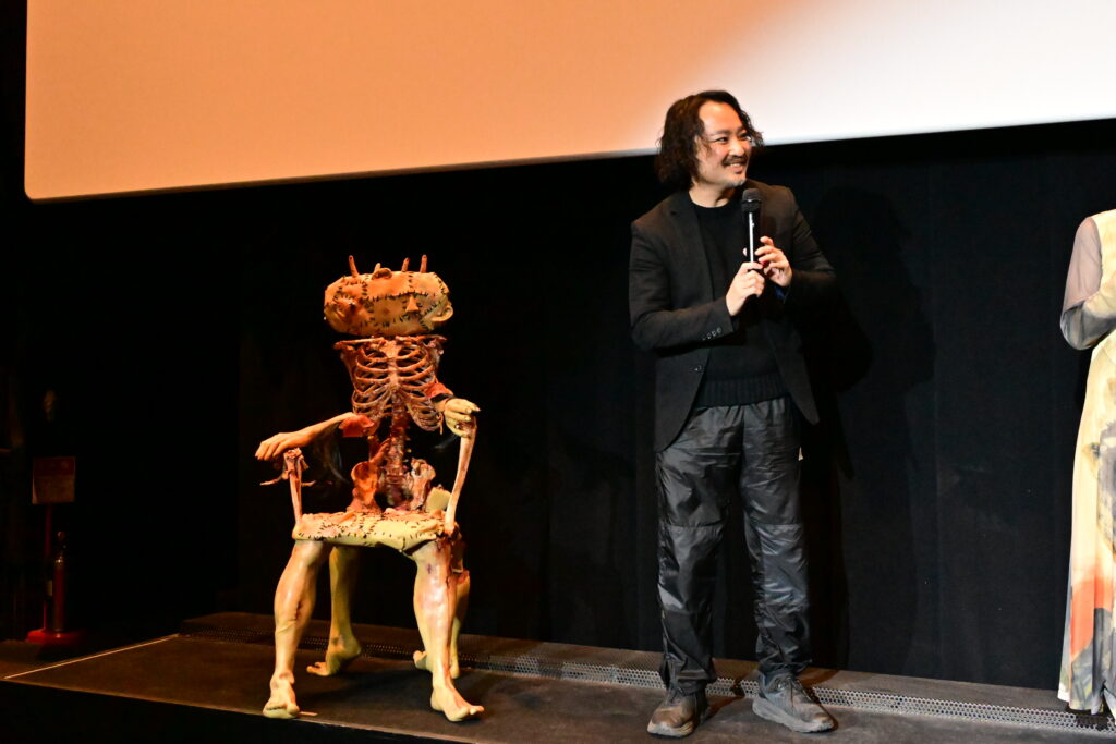 満員御礼となった会場のステージ上には、一ノ瀬演じる九条新介が劇中で殺害した9人分の人体パーツを組み合わせて作られた“人体椅子”が展示された。宇賀那監督は「上映前なのに全体像が見えちゃってネタバレですね。でも懐かしいです。実際に座ることもできます」と楽しそうに解説。一ノ瀬も「僕は髪の毛の部分がお気に入り。劇中では右手に臓器が乗っていて、腕もいい感じに動くんです」と見どころを語った。