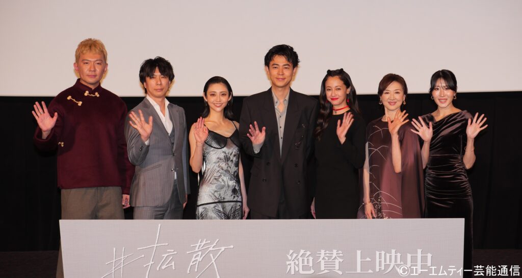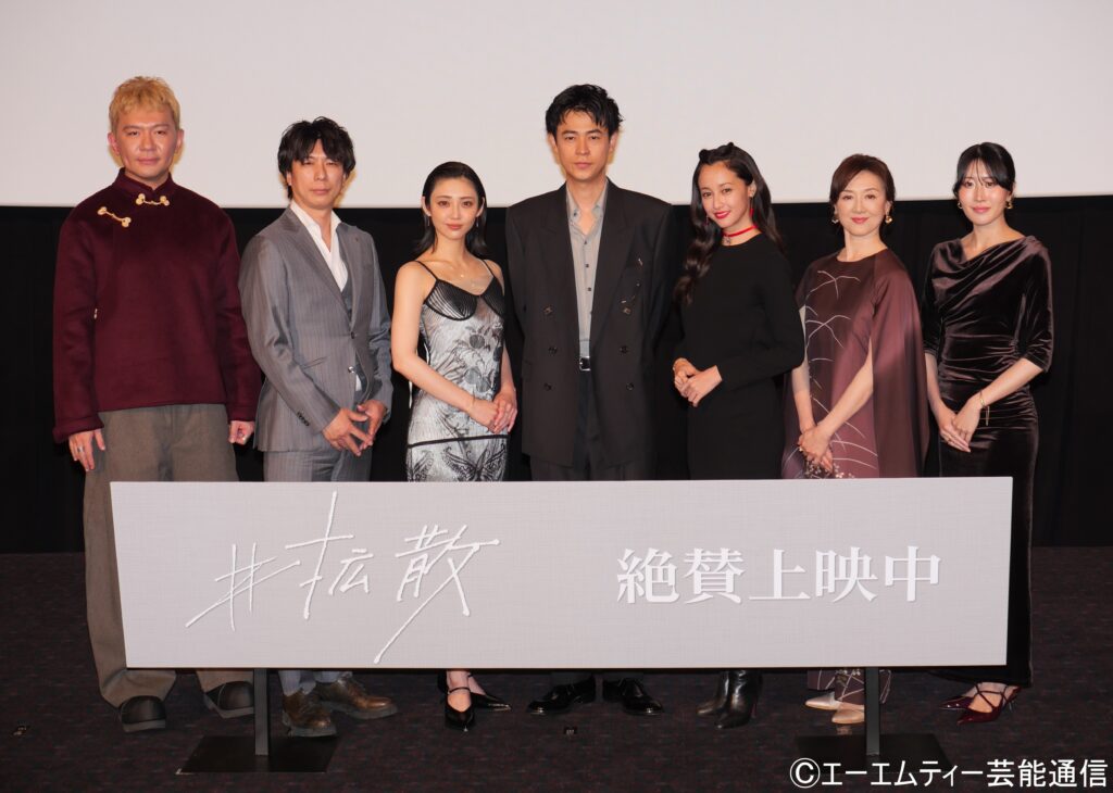 映画『#拡散』の初日舞台挨拶が2月27日(金)に東京・TOHOシネマズ日比谷で行われ、主演の成田凌、共演の沢尻エリカ、山谷花純をはじめ、赤間麻里子、船ヶ山哲、鈴木志音、そしてメガホンを取った白金(バイ・ジン)監督が登壇した。